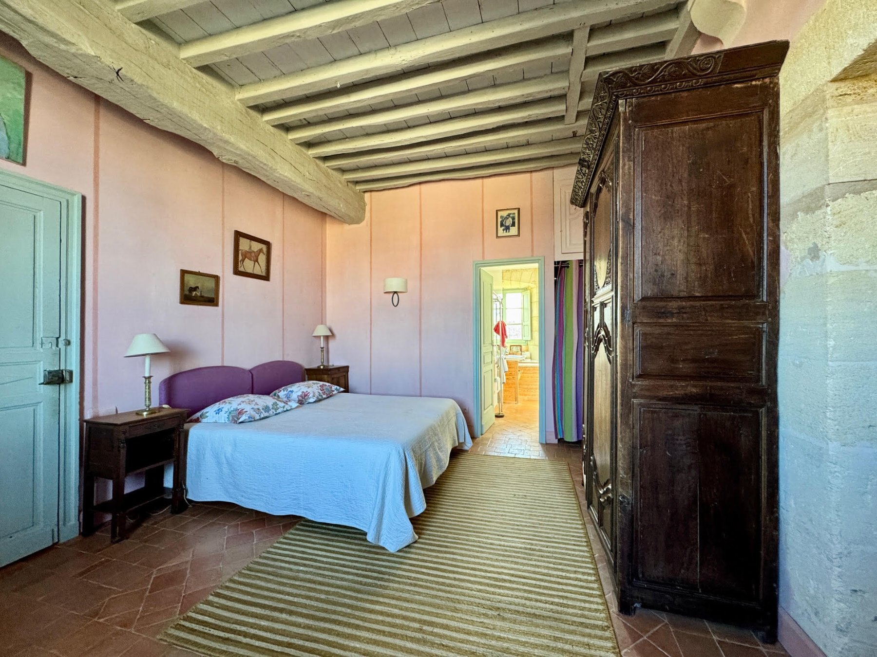 Au cœur du château, cette charmante chambre a vu passer les époques et les générations en gardant son cachet. Espace intimiste dans un esprit châtelain avec sa magnifique armoire, les poutres apparentes et sa belle porte en bois. Salle de bains privative. Très lumineuse, vue sur les vignes depuis la salle de bains et sur l’architecture et les massifs fleuris depuis la chambre.