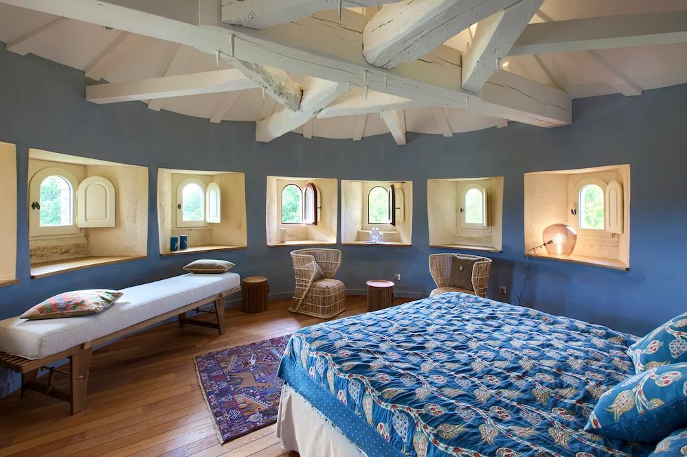Son atmosphère chaleureuse est sublimée par des matériaux nobles et des volumes lumineux. Vous apprécierez être en hauteur dans une des tours du château ainsi que ses différents espaces : un coin lecture et un espace pour prendre un thé, parfaits pour profiter pleinement de votre séjour. Vue à 360° sur tout le paysage environnant, bois, vignes et jardins.